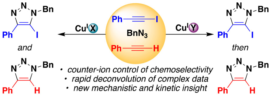 Chung, R.; Vo, A.; Fokin, V. V.*; Hein, J. E.* “Catalyst activation, chemoselectivity, and reaction rate controlled by the counterion in the cu(I)-catalyzed cycloaddition between azide and terminal or 1-iodoalkynes.” ACS Catal., 2018, 8(9), p. 7889–7897.