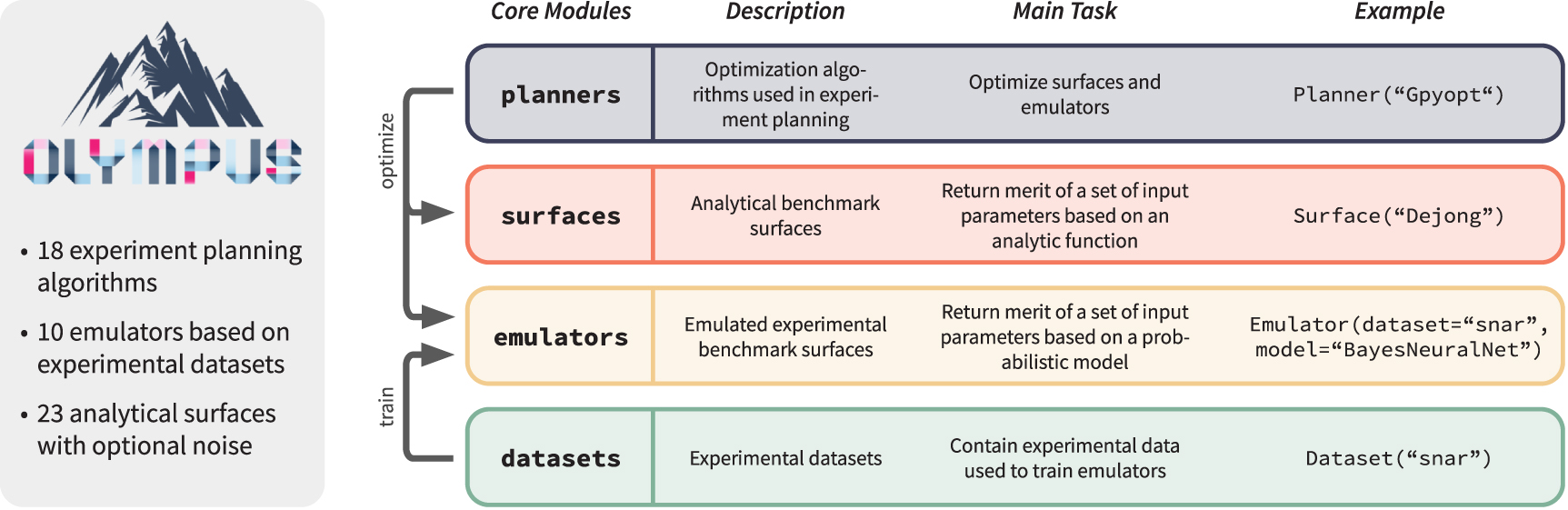 Häse, F.; Aldeghi, M.; Hickman, R. J.; Roch, L. M.; Christensen, M.; Liles, E.; Hein, J. E.; Aspuru-Guzik, A.* “Olympus: A benchmarking framework for noisy optimization and experiment planning.” Mach. Learn.: Sci. Technol., 2021, 2(3), 035021.